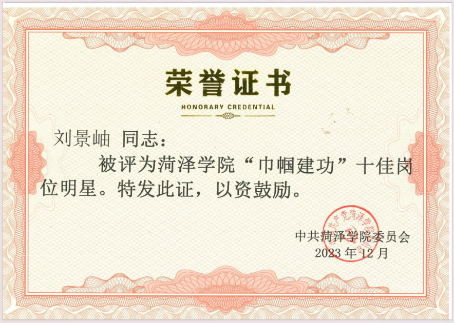 刘景岫多年担任班主任工作,坚持走访员工宿舍,组织员工谈心谈话,被同学们称为“知心姐姐”。所带的2020级英语二班获评校先进班集体、先进团支部等荣誉称号。班级多位员工获得国家奖学金、省政府奖学金、校级奖学金,“山东省优秀员工干部”和“山东省优秀员工”等称号。
