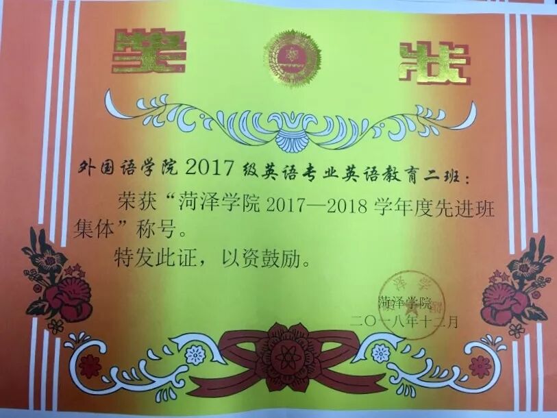 2017级英语教育二班是一个拥有32名成员的班集体。在这个温暖的大家庭中,每个人都在尽心尽力的为班级奉献,为这个集体增光添彩。在2017——2018学年,我们班在“读书节”活动中,荣获“书香班级”称号。在“宿舍安全知识竞赛”中获得三等奖等等。32名同学一条心,同学们也积极参加学校和学院开展的各项活动,为班级争光添彩。