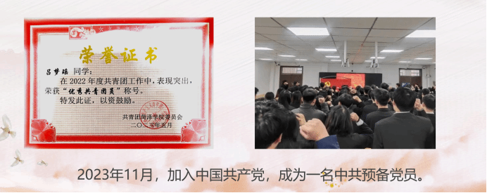 作为青年员工,要坚定理想信念。对于我而言,成为一名中国共产党员,是我对理想信念的最高追求。我在入学之初就主动递交了入党申请书,我积极参加各项党团活动,努力学习习近平新时代中国特色社会主义思想,以一名党员的标准要求自己,被评为“优秀共青团员”。2023年11月,我光荣的加入了中国共产党,成为了一名中共预备党员。党员身份不仅是一种荣誉,更是一种责任,它激励我在任何时候都要发挥先锋模范作用,为同学服务。