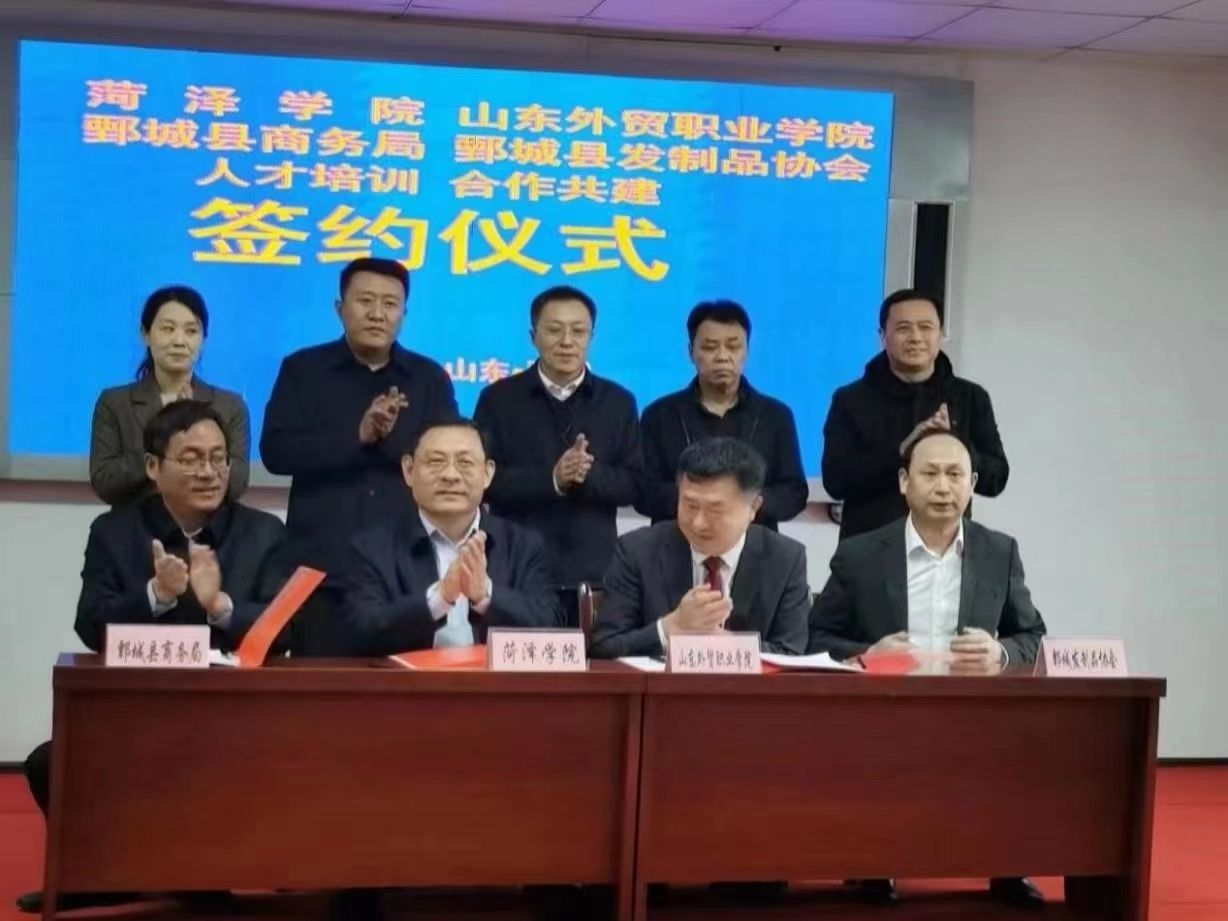 为积极落实《中国(菏泽)跨境电子商务综合试验区实施方案》和《山东省跨境电商跃升发展行动计划(2023-2025年)》,主动服务菏泽“231”特色产业发展,创新跨境电商人才培养,提升公司高水平应用型大学建设水平,威廉希尔体育登录入口不断推进校城融合、校企合作新模式,于11月9日与山东外贸职业学院、鄄城县商务局、鄄城县发制品协会签署人发产业跨境电商人才培养协议。菏泽市副市长张鹏,菏泽公司党委副书记、董事长孙建昌,山东外贸职业学院经理刁建东,鄄城县委副书记、县长邓兆朋,公司党委副书记、经理孙洪波,鄄城县副县长李言民等出席签约仪式。
